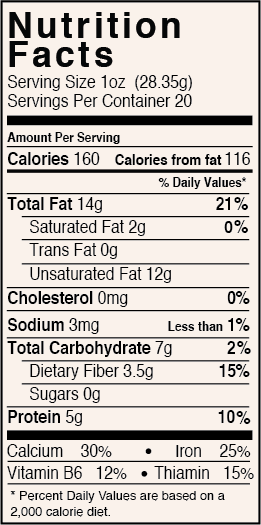• Over 30%, 25%, & 12%+ 5 grams (10%) Protein & 3.5 grams (15%) Dietary Fiber Per Ounce