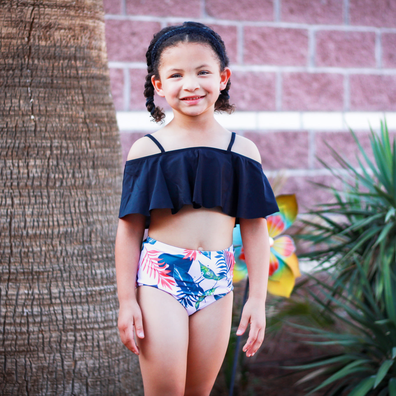 Girls 2 piece Black Ruffle Pink Tropical Bikini bathing suit