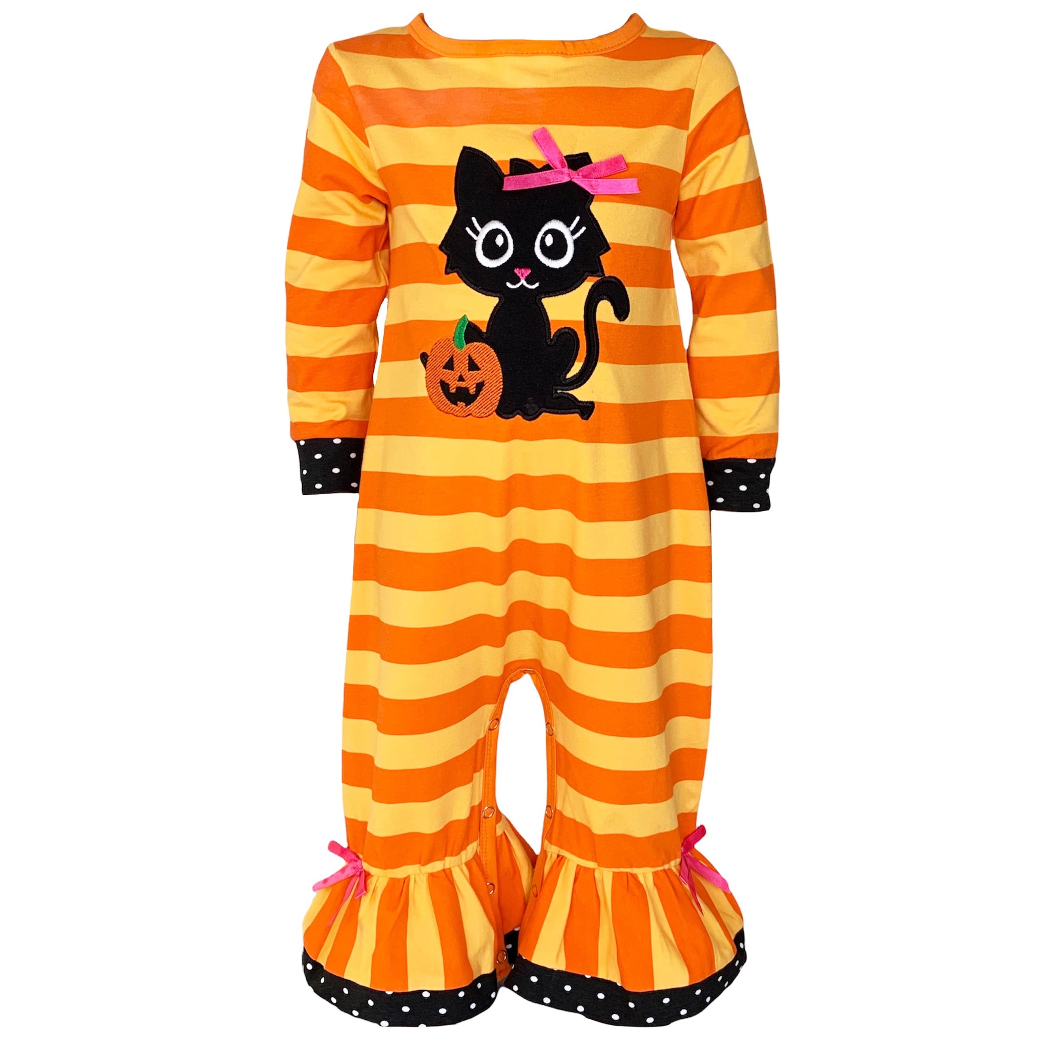 Boutique Baby Girls Orange Striped Cotton Knit Halloween Romper. Romper features Adorable Friendly Black Cat Applique. Coordinating polka dot trim. Romper boasts in crotch for easy on and off.