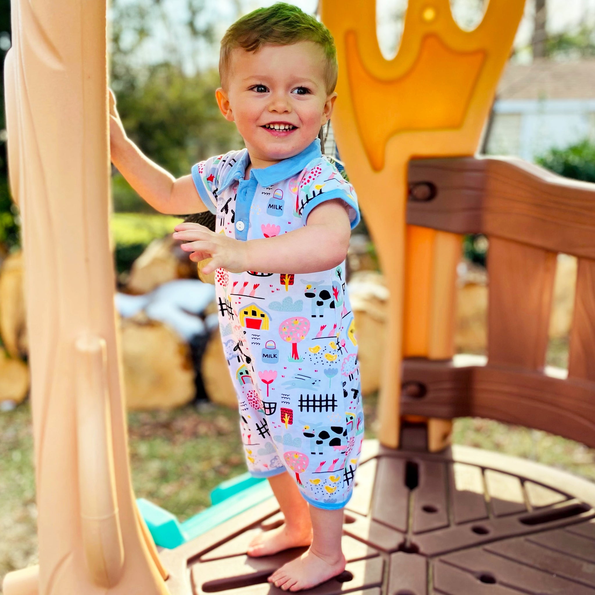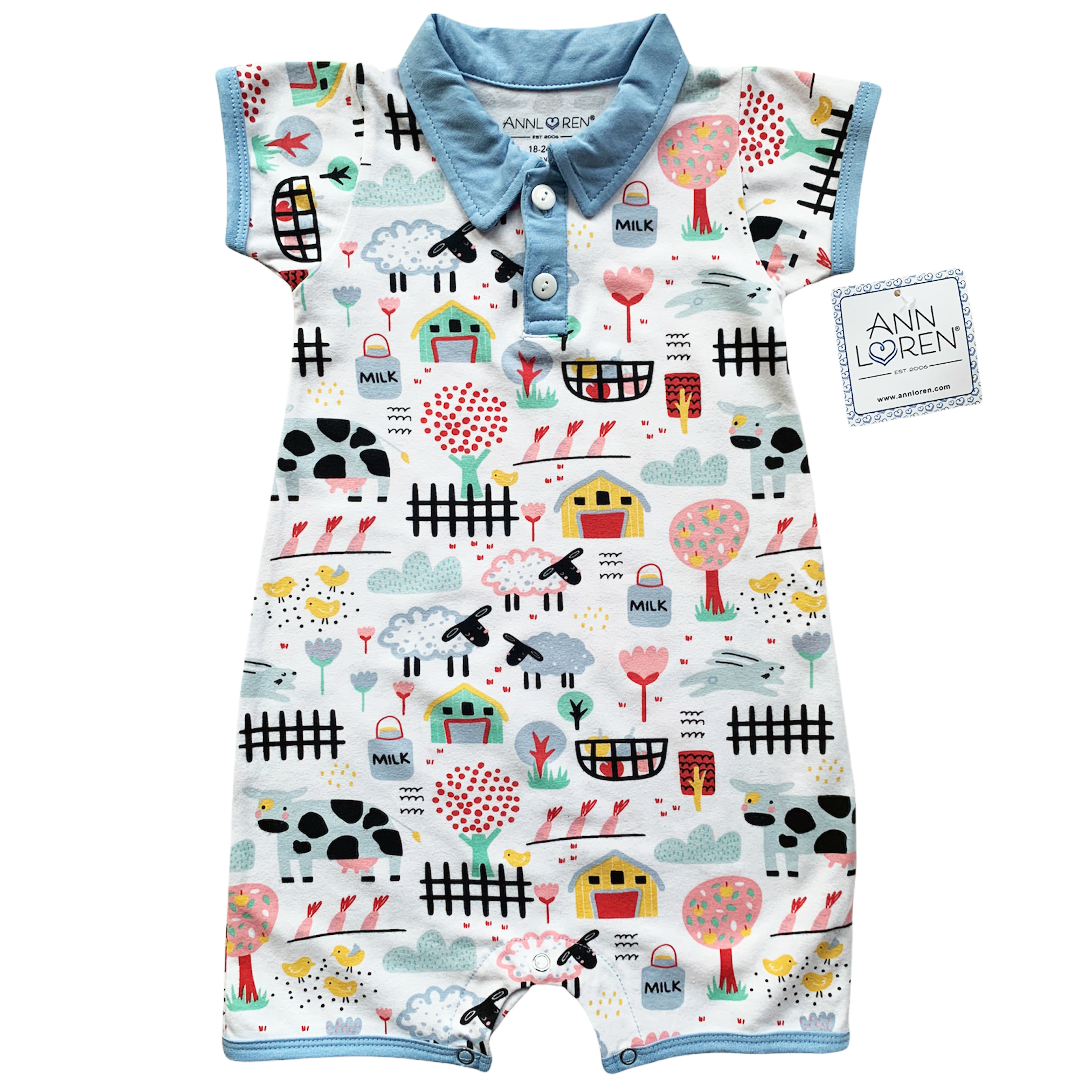 AnnLoren Boys One Piece Short Sleeve Romper. Fun Farm Animal Print with blue collar and 2 buttons in front. Snaps at inseam for easy changing and dressing. The 95% high quality Egyptian cotton and 5% stretchy lycra fabric is soft and comfortable. Premium dye's ensure that your outfit won't fade or run. Machine Washable.