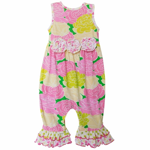 AnnLoren Blooming Floral Romper. Features Vibrant and Soft Pink and Green Big Bouquet Flower print. Sleeveless romper with snap closures behind neckline and crotch. 3 coordinating rose appliques at the waist. Finished with 2 gathered ruffles at ankles. Made with Soft and Stretchy 95% Egyptian Cotton 5% Spandex Knit. Machine Washable.