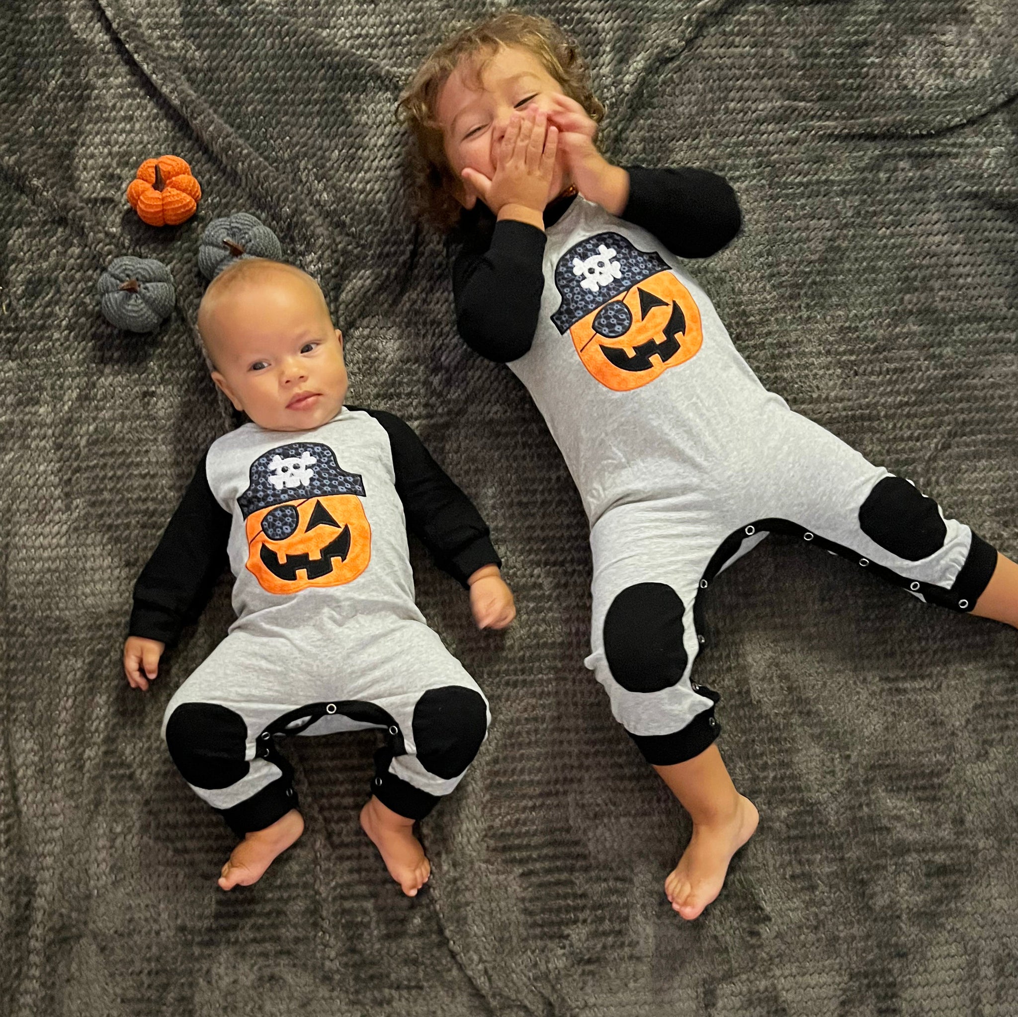 AnnLoren Boys Halloween Pirate Jack O Lantern One Piece Long Sleeve Romper.  Snaps at inseam for easy changing and dressing.