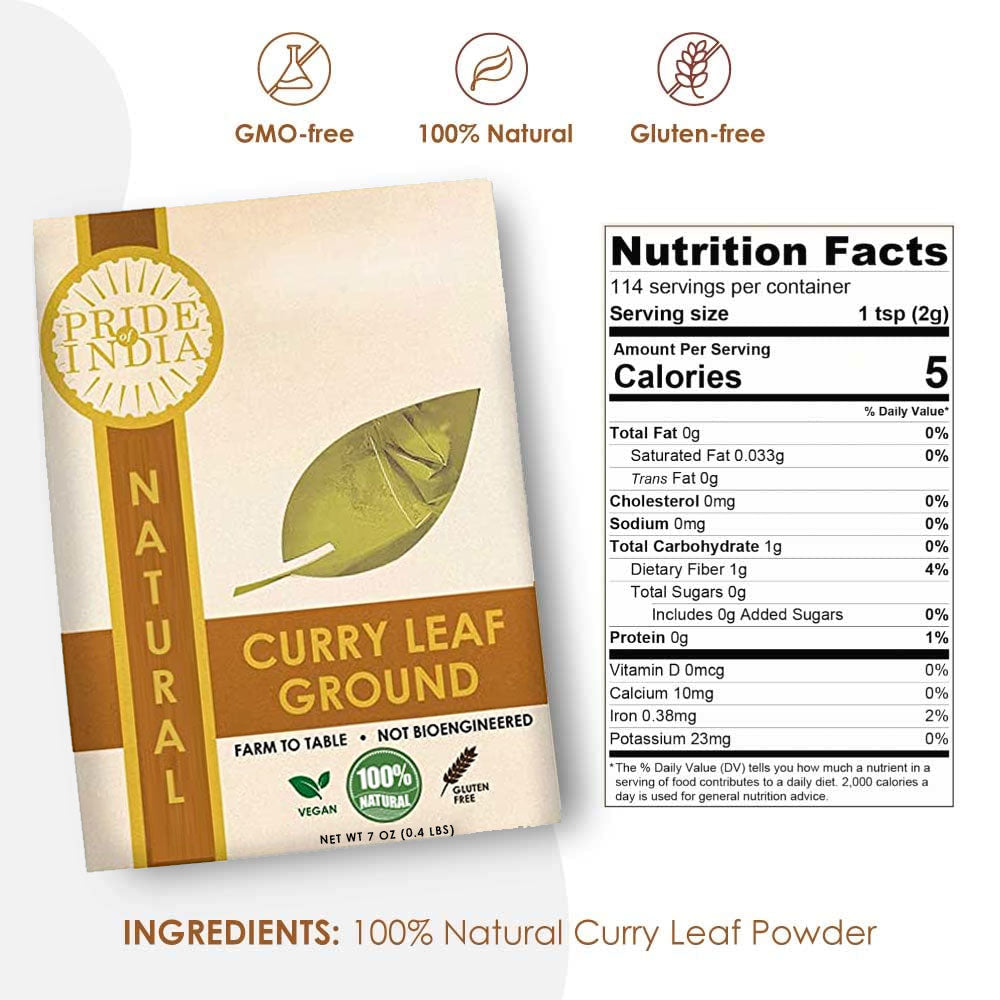 • 100% CURRY LEAF GROUND: Pride of India curry leaf ground has a fresh aroma and unique yet complex flavor thanks to the sustainably sourced quality leaves that goes through stringent checks before processing and packing in as ground powder. Enjoy the best alternative to these aromatic leaves with our quality curry ground.