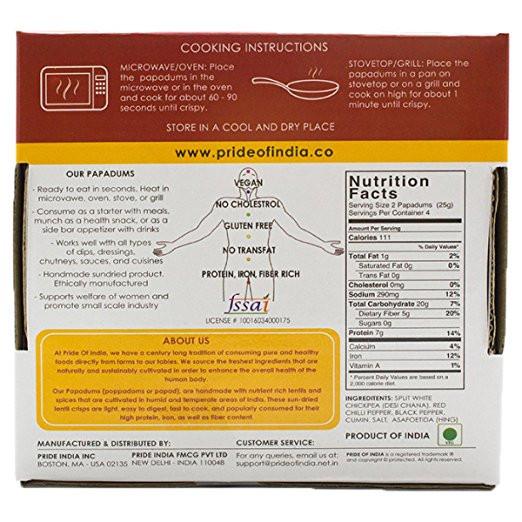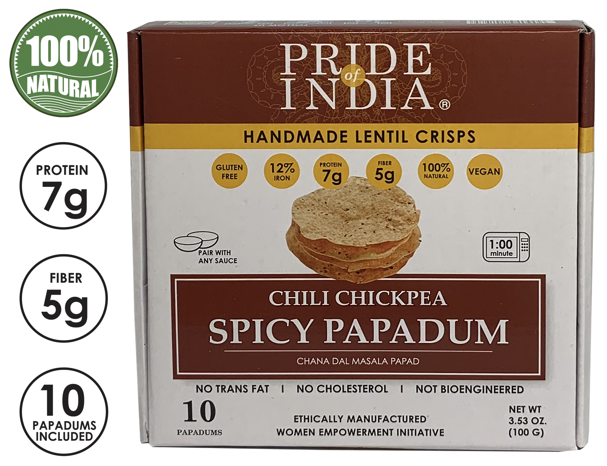 Our papadums (poppadoms or papad) are handmade with nutrient rich lentils and spices that are cultivated in humid and temperate areas of India. These sun-dried lentil crisps are light, easy to digest, fast to cook, and popularly consumed for their high protein, iron as well as fiber content.